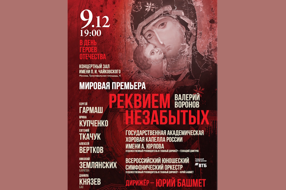 В День Героев Отечества, 9 декабря, в Концертном зале имени П.И. Чайковского состоится мировая премьера сочинения, созданного как дань глубочайшего уважения и благодарности – «Реквиема Незабытых» Валерия Воронова. Музыкальное полотно, созданное специально по заказу маэстро Башмета и сотканное из слов поэтов, прошедших через войну - К. Симонова, Б. Пастернака, Р. Гамзатова, Ю. Левитанского - станет голосом тех, чьи имена унесло время, но чья жертва навсегда вписана в историю.
