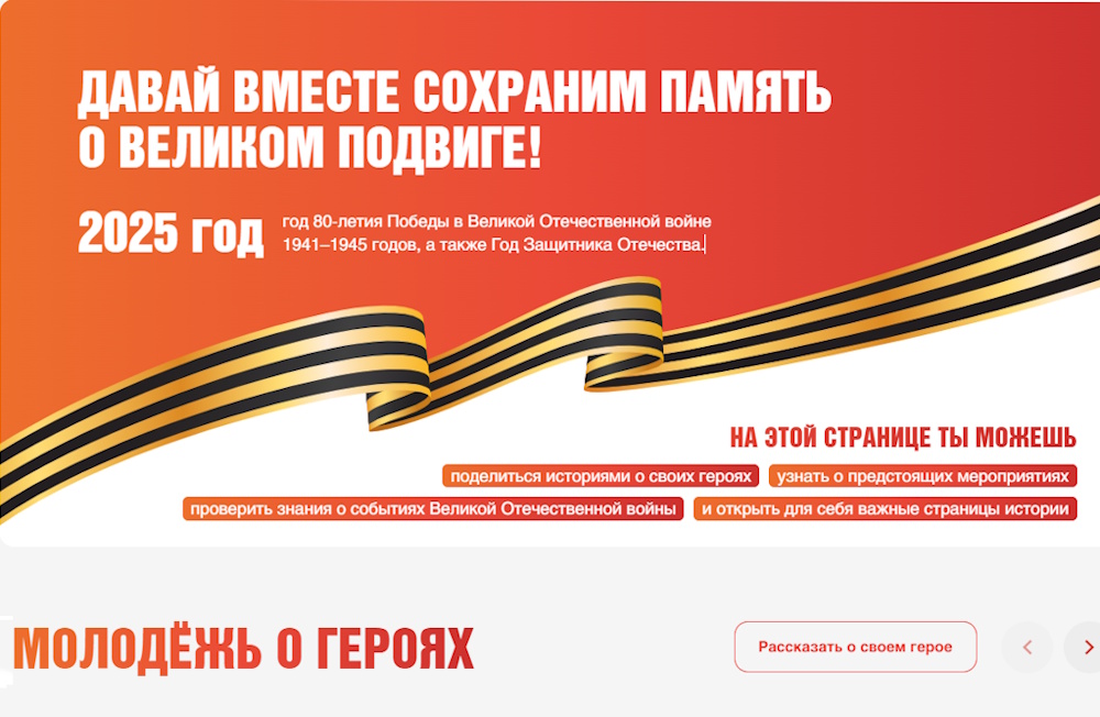 Также на сайте собрана информация о предстоящих патриотических мероприятиях в городе. Молодым москвичам предлагают присоединиться к памятным акциям, историческим диктантам, экскурсиям по местам боевой славы и другим событиям, приуроченным к 9 Мая.