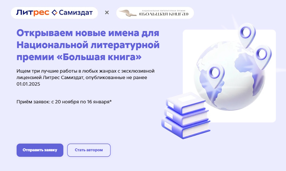 Сервис для digital-авторов Литрес Самиздат объявляет о начале отборочного этапа для участия в новом сезоне национальной литературной премии «Большая книга». По его результатам платформа выдвинет трёх авторов на соискание престижной награды. Произведения номинантов будет оценивать профессиональное жюри, в которое вошли современные писатели — Яна Вагнер, Вера Богданова и Александр Снегирёв.
