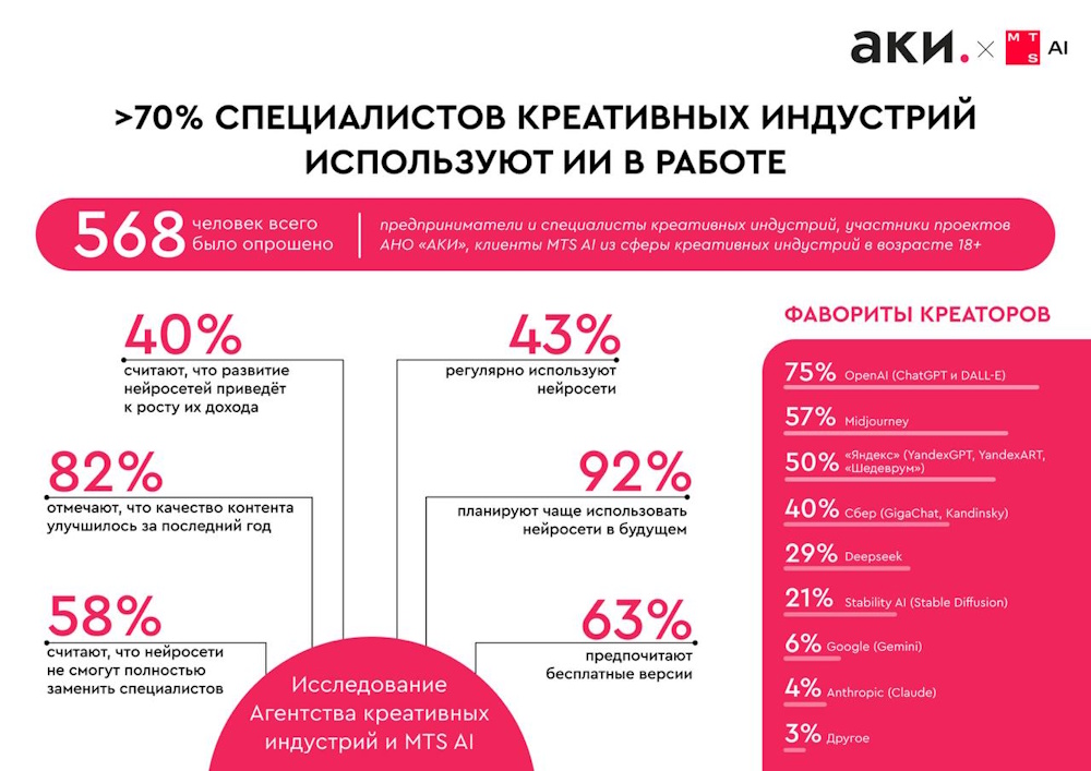 Агентство креативных индустрий Москвы и компания MTS AI провели исследованиеприменения искусственного интеллекта в креативных индустриях.