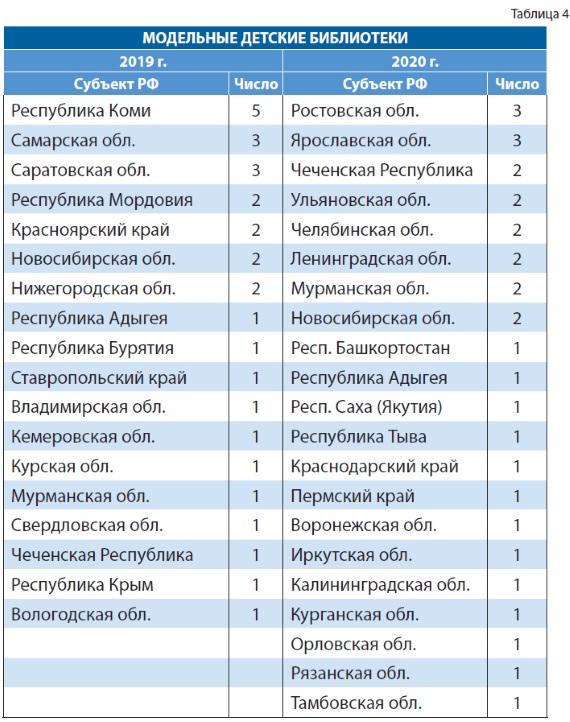 В России почти 37 тыс. общедоступных библиотек системы Министерства культуры РФ, из которых 3187 — специализированные детские, и около 40 тыс. школьных библиотек. По нацпроекту «Культура» планируется создать 660 модельных библиотек. В прошлом году из 134 модельных библиотек 31 была детской, в 2020-м — выбрано 32. Тенденция такова, что треть обновляемых библиотек детские (табл. 4).