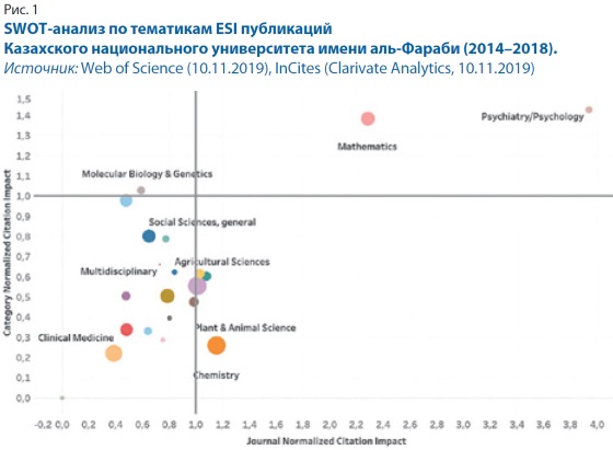 По оси ординат отложен показатель CNCI, в качестве базового уровня указано значение 1, по оси абсцисс — показатель JNCI (Journal Normalized Citation Impact), формируемый аналогично CNCI, но нормирование проводится не по предметной области, а по конкретному журналу, т.е. в знаменателе оказывается среднее цитирование публикаций того же типа, вышедших в том же году в том же журнале, что и анализируемая статья. Значение JNCI больше единицы показывает, что анализируемые публикации цитируются в среднем лучше, чем во всём журнале [1, с. 94]. Усреднение показателей JNCI даёт представление о том, как отличается уровень анализируемых статей от среднего уровня других материалов в журналах, в которых они опубликованы. Из рисунка видно, что публикации в области математики в университете цитируют лучше, чем аналогичные публикации в мире, а у их авторов есть возможность выбирать более сильные журналы для представления своих научных результатов и участвовать в международных коллаборациях на более выгодных условиях. Также если рассматривать области, перспективные с точки зрения привлечения иностранных студентов, то приоритетное развитие математики может обеспечить быстрое попадание университета в предметный рейтинг по математике ARWU (Шанхайского рейтинга). Однако принимать стратегические решения на основании одного лишь анализа публикаций рискованно, так как развитие, например, химии может быть более приоритетным в силу высокого спроса на студентов-химиков.