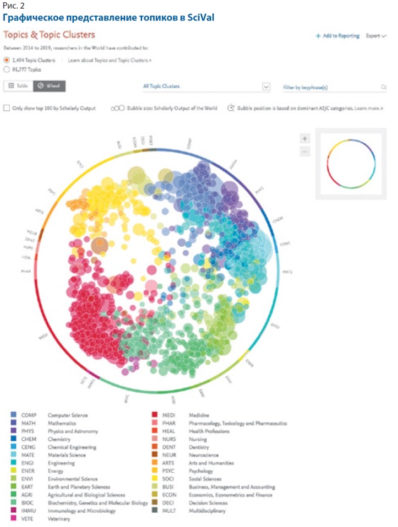 Аналогично можно провести анализ публикаций в базе Scopus и связанном с ней аналитическом ресурсе SciVal. В последнем имеется много дополнительных возможностей. Это прежде всего анализ востребованности или актуальности конкретных исследований. На базе всей совокупности публикаций, проиндексированных в Scopus с 1996 г., выделено 96 тыс. так называемых топиков. Эта кластеризация проведена на основании анализа библиографических списков проиндексированных материалов и документов, их цитирующих. Далее на основании анализа цитирований, просмотров и уровня журналов проведена оценка востребованности (проминентности) топиков или кластеров топиков по шкале от 1 до 100, где 100 — наивысший показатель востребованности. Для каждой публикации можно определить, к топику какой проминентности она относится. По этим данным в SciVal приводится также графическое отображение всей совокупности публикаций для организаций или стран (рис. 2).