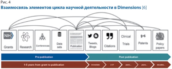 Схематично все взаимосвязи, анализ которых доступен в Dimensions, представлены на рис. 4.