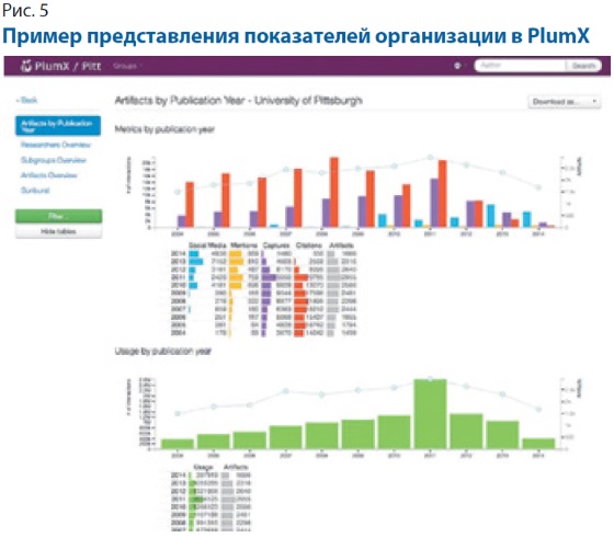 Большое значение для анализа востребованности исследований имеют показатели альтметрики: просмотры и скачивание публикаций, сохранение их в менеджерах цитирования, упоминания в социальных сетях и др. Высокие показатели альтметрики во многих случаях коррелируют с дальнейшими показателями цитирования публикаций, а для социально-гуманитарной сферы, где цитирования показывают важность публикаций в гораздо меньшей степени, чем в естественных и технических науках, могут быть и сами по себе индикаторами значимости исследования. Показатели альтметрики включены в Scopus и Dimensions, а также представлены в отдельном ресурсе PlumX Metrics (рис. 5), где собраны в одном месте показатели по использованию публикаций, их упоминанию в СМИ, блогах, социальных сетях и цитированию. PlumX — новый инструмент по использованию альтернативных и традиционных метрик для измерения значимости научно-исследовательской работы и объёма цитирования публикаций научных сотрудников.