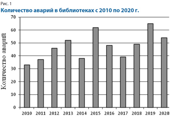 Как показал анализ, с 2010 г. по 2020-й аварийных ситуаций не было только в семи библиотеках (12% от общего количества анкет): в Забайкальской краевой универсальной научной библиотеке (УНБ) (г. Чита), Липецкой областной юношеской библиотеке, Рязанской областной УНБ, Тамбовской областной УНБ, Томской областной УНБ, Усть-Ордынской национальной библиотеке, Владимирской областной специальной библиотеке для слепых. За период с 2010 по 2020 г. В 51 региональной библиотеке случились 529 аварийных ситуаций, каждый год — от 33 до 64 аварий (рис. 1). В семи библиотеках за 10 лет произошло по одной аварии, в 12 библиотеках — более 10.