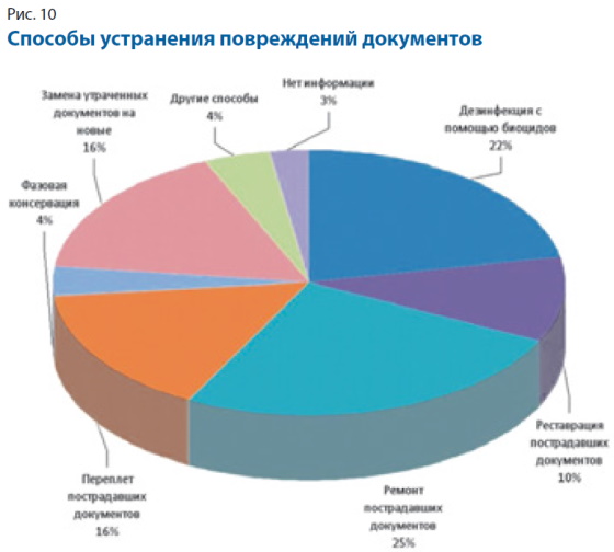 После аварийных ситуаций 25% всех применяемых способов консервации приходилось на ремонт документов. При устранении повреждений документов в 18 библиотеках применяли дезинфекционную обработку биоцидами (22%). Чаще всего использовали рекомендуемые для обработки бумаги Metatin GT или «Санатекс». В 14 библиотеках пострадавшие документы переплетали или реставрировали, в семи — помещали в контейнеры из бескислотного картона. В 15 библиотеках пришлось провести замену (рис. 10).