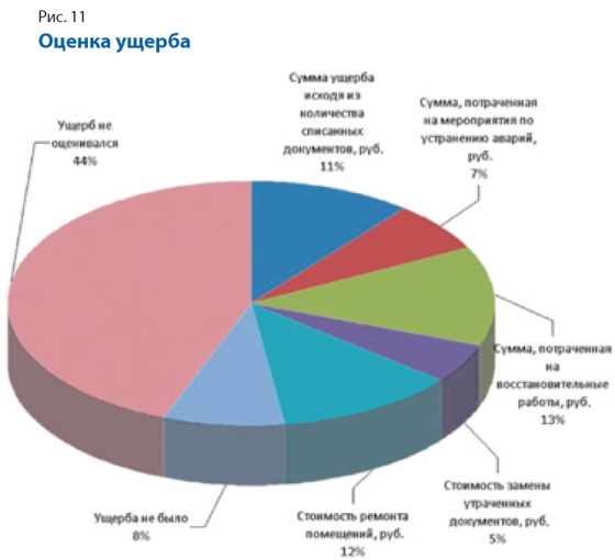 Количественные данные по оценке ущерба от аварий представили только четыре библиотеки. Основная сумма была потрачена на восстановительные работы (переплёт, ремонт, реставрацию, изготовление контейнеров, дезинфекцию и пр.) и составила 265 тыс. рублей. На мероприятия по устранению аварий (приобретение материалов, осушителей и пр.) потрачено около 27 тыс. рублей. Сумма ущерба исходя из количества списанных документов составила более 48 тыс. рублей.