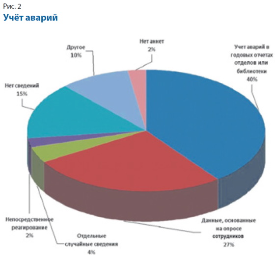 В основном произошедшие аварии были отражены в годовых отчётах или журналах учёта аварийных ситуаций, а 27% от их общего числа описаны со слов сотрудников библиотек, принимавших непосредственное участие в ликвидации последствий аварий. В 15% библиотек о них нет никаких сведений (рис. 2).