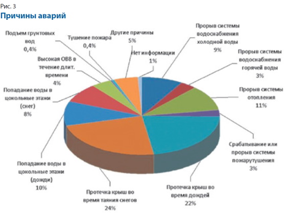 Основными причинами аварий были протечки крыш во время дождей или таяния снега (55% от общего числа произошедших аварий), реже — попадание воды в цокольные этажи в результате дождей и таяния снега (18%), прорыв системы холодного водоснабжения (11%) и системы отопления (9%) (рис. 3).