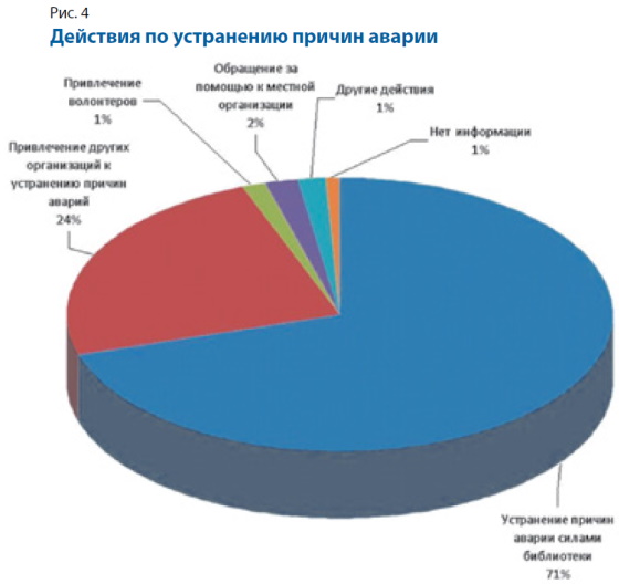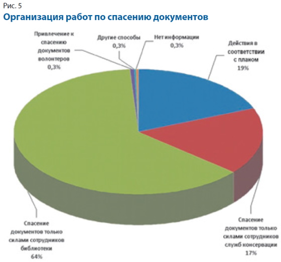 При ликвидации аварийных ситуаций организация работ по спасению документов в 21 библиотеке (в 19% из всех 106 аварий, произошедших в этих учреждениях) проводилась в соответствии с планом действий в случае возникновения аварийных ситуаций. В 44 библиотеках в большинстве случаев (63% из 336 аварий) спасение документов осуществлялось только силами сотрудников самих библиотек, и, что очень важно, в 13 из них работы возглавляли специалисты из отделов консервации. А в пяти библиотеках работы по спасению осуществлялись только сотрудниками служб консервации и лишь в одной библиотеке привлекали волонтёров (для устранения причин волонтёры участвовали в трёх библиотеках; рис. 5).