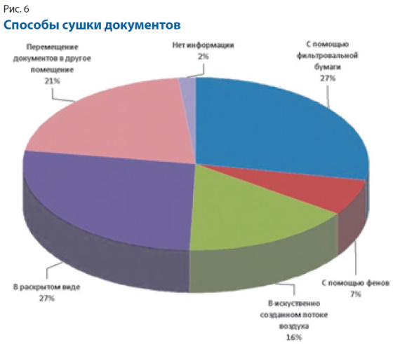 Для того чтобы минимизировать повреждения, необходима своевременная грамотная сушка документов, которая должна предотвратить возникновение плесени, деформацию документов, слипание листов. Респондентам предлагали следующие варианты: