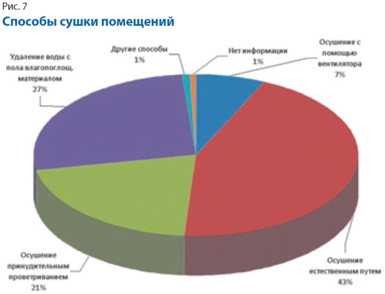 Сушка помещений в большинстве аварийных ситуаций происходила естественным путём (44%) или принудительным проветриванием (21%). Треть библиотек использовали влагопоглощающие материалы для удаления воды с пола. В 14 библиотеках дополнительно использовали тепловентиляторы (рис. 7).