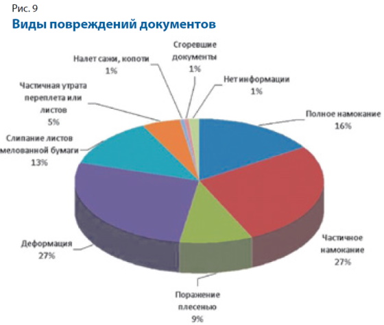Нет информации о степени повреждения документов на мелованной бумаге (13% от общего числа пострадавших документов — это довольно большая величина). Следует отметить, что в методических пособиях и на семинарах часто делается акцент на особой опасности намокания таких документов, поскольку при этом может происходить частичная или даже полная утрата их эксплуатационных свойств (слипание листов в сцементированный блок, зачастую необратимое).