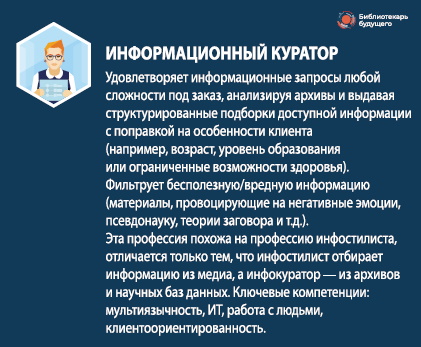 Информационный куратор — специалист, способный выполнить информационный запрос любой сложности, построить индивидуальную информационную траекторию. Может стать своеобразным информационным диетологом, помогающим снизить потребление вредного контента, способным защитить психофизическое здоровье человека. Это специалист, обеспечивающий цифровую инклюзию, помогающий людям любого возраста адаптироваться к цифровой среде и виртуальности.