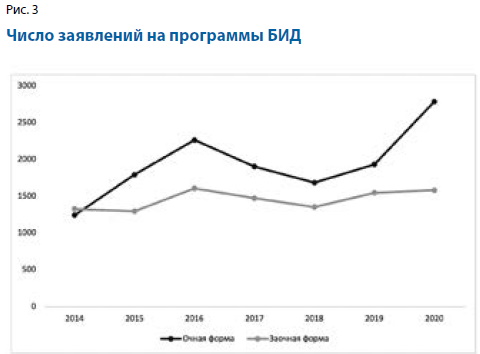 Как показывает анализ рис. 2, число обучающихся на бакалаврских программах библиотечно-информационной деятельности (БИД) с 2014 г. Неуклонно сокращалось, и даже сильнее, чем в целом по программам высшего образования, т.е. провалы не могут быть однозначно объяснены демографическими факторами. Тем не менее в последние два года число желающих поступить учиться на библиотекаря несколько увеличилось (рис. 3).