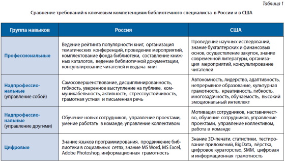 Исследование показало, что по мере повышения уровня развития отрасли существенно расширяется состав навыков, необходимых библиотекарю. Например, в США библиотекарь — это уже почти ИT-специалист. В группе цифровых навыков компетентностного профиля американского библиотекаря знание 3D-печати, статистики, тестирование приложений, BigData, вёрстка, цифровое кураторство, SMM, цифровая и информационная грамотность. В России список требований значительно скромнее: знание MS Word, MS Excel, Adobe Photoshop, иногда — языков программирования, продвижение библиотеки в социальных сетях, информационная грамотность, и даже эти компетенции занимают в запросах незначительную долю. Работодатели практически не запрашивают навыки в сфере научно-аналитической (исследования, разработка программ развития), методической деятельности (мониторинг и диагностика библиотечной сферы). Наблюдается повышенный спрос на компетенции, связанные с работой с клиентами, проведением мероприятий.