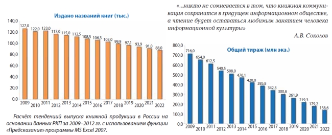 4. В США за 2012 г. число читателей э-книг возросло на 7%, а число читающих печатные книги упало на 5% (данные Pew Internet – libraries.pewinternet.org/2012/12/27/e-book-readingjumps-print-book-reading-declines). В Великобритании продажи печатных книг в 2012 г. упали на 5% (данные Nielsen BookScan), и в то же время реализация электронных книг составила 13–14% от общего объёма книжных продаж в стране в количественном выражении (данные Bookseller – pro-books.ru/sitearticles/11527). По прогнозу 2011 г. британской компании Juniper Research, ежегодные мировые продажи электронных книг в 2016 г. достигнут суммы в 9,7 млрд долларов США. В России, по данным РКП, в 2012 г. падение по числу названий изданных книг составило 5%, а падение общего тиража – 11,8 %. При этом общие объёмы выпуска книг сокращаются каждый год, начиная с 2009 г.