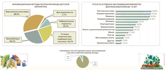 О.П. Мезенцева в докладе «Библиотечно-информационное обслуживание детей: стратегии развития и новые подходы» представила статистический анализ работы библиотек, обслуживающих детей. Дети составляют пятую часть населения страны. В России 3257 детских библиотек. Но все публичные библиотеки включают в свою работу подрастающее поколение, 37% всех читателей — дети. Основные результаты исследования представлены на рис 1-3. Выступающая отметила, что в профессиональный стандарт включена трудовая функция «Библиотечно-информационное обслуживание детей», а также, ссылаясь в том числе на Стратегию развития библиотечного дела в Российской Федерации на период до 2030 года, подчеркнула необходимость активизировать методическую работу в библиотеках, направив её на внедрение новых форм работы с юными читателями для привлечения детей к чтению.