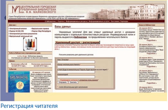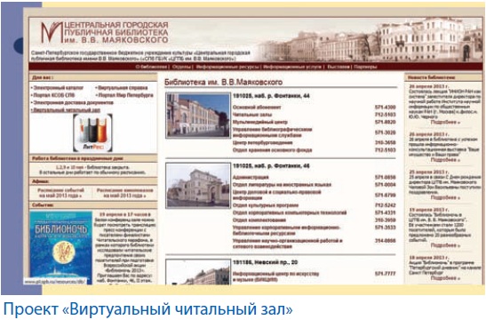 Одна из задач нашей библиотеки заключается в обеспечении доступа к лицензионным электронным ресурсам наибольшему числу читателей, крайне заинтересованных в работе с такими ресурсами вне стен библиотеки в круглосуточном режиме, в комфортных условиях. Такую возможность ЦГПБ им. В.В. Маяковского предлагает в рамках проекта «Виртуальный читальный зал» (www.pl.spb.ru/resources/db). Проект стартовал в ноябре 2012 г.