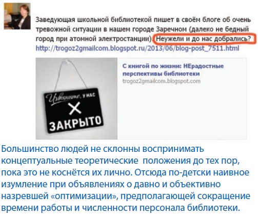Первое, что стало очевидным, – это явно недостаточное понимание экспертами и, полагаю, основной аудиторией читателей вызовов, каковые несёт библиотекам система цифровых коммуникаций. Усматриваю в этом свою вину, поскольку не донёс достаточно аргументированно мысль о том, что в мире, где основным принципом информационного обслуживания становится «всем – всё – везде – всегда», крайне сложно найти место библиотекам со всеми их фондами печатных изданий, выделенными помещениями и персоналом. В картине мира, изменившейся для всех без исключения институтов системы информационных коммуникаций, библиотекарям предстоит переосмыслить собственную деятельность. Переосмысление этого требует чёткого понимания возникшей системы отношений и свободы от заблуждений, которые, к сожалению, содержались в доводах оппонентов.