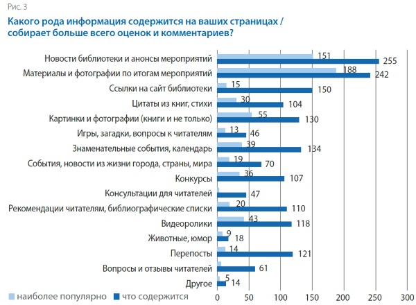 Основную часть контента, представленного в библиотечных группах, занимают новости библиотеки и анонсы событий (рис. 3). Как следствие, наибольшей популярностью у читателей пользуются материалы и фотографии по итогам проведённых мероприятий.