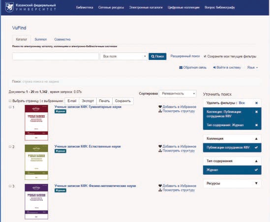 Подводя итог, можно сделать следующие выводы. На основе современной, постоянно совершенствующейся open source-платформы VuFind был создан качественный поисковый сервис, интегрирующий все университетские ресурсы в единое информационное пространство. Данное решение является масштабируемым, реализуется в виде облачного сервиса, который может быть использован практически в любой вузовской библиотеке без значительных материальных затрат.