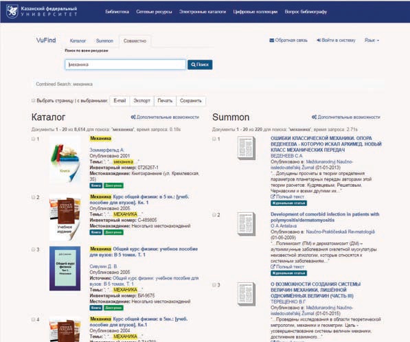 Необходимо отметить, что большинство библиотек крупных университетов России помимо собственно обеспечения своих посетителей книгами и другими печатными изданиями, как правило, предоставляют доступ к различным внешним электронным ресурсам, как зарубежным (Elsevier, ProQuest и др.), так и отечественным (eLibrary, ЭБС), формируют собственные коллекции цифровых документов. Каждый из поставщиков упомянутых ресурсов предлагает свой интерфейс поисковых запросов. Например, Казанский университет имеет доступ более чем к 50 информационным источникам. Поэтому вполне естественно желание организовать поиск по этим базам данных в одном запросе, т.е. опять возникает проблема создания интегрированного поискового интерфейса.