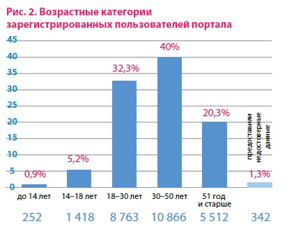 Среди постоянных пользователей портала были люди разных возрастов: самому младшему читателю оказалось восемь лет, самому старшему — 95 (рис. 2). Большая активность наблюдалась среди увлечённых людей. Как правило, их интересовала литература конкретной области знаний и для них такая акция стала дополнительной возможностью приобрести книги, которые уже не переиздаются и не находятся в Сети. Стоит отметить, что благодаря акции в столичные библиотеки записалось около 2 тыс. новых читателей.