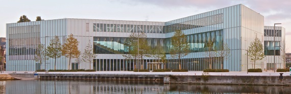 Библиотека, открытая в 2017 г., была спроектирована голландским архитектором Ремом Колхасом, автором знаменитой центральной библиотеки Сиэтла. Месторасположение было выбрано в рамках проекта по возрождению полуострова Кан, когда-то заброшенного порта. Решение преобразовать именно эту территорию имело символический подтекст: в своём проекте архитектор учёл желание правительства расположить здание на стыке двух частей города, отделив библиотекой старый город от нового. Здание в плане имеет форму креста, две части здания стремятся к двум главным памятникам города: аббатству святого Стефана и аббатству Святой Троицы, в то время как две другие указывают на вокзал и полуостров порта, повёрнуты к будущему. Каждая ветвь креста содержит тематическую зону: стеллажи для чтения литературы, витрины для предметов искусства, кабинет для гуманитарных наук и раздел для науки и техники. План довольно простой и понятный посетителю, что облегчает взаимодействие между отделами.