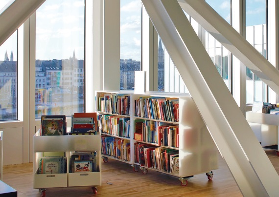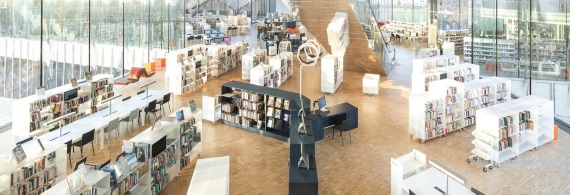 Все стеллажи на колёсиках, поэтому библиотекари могут постоянно менять и планировать их положение. Стеллажи оснащены сенсорными экранами, которые дают доступ к более чем 100 тыс. оцифрованных произведений. В каждом отделе есть информационный стол, а разделе искусств — пункт, посвящённый индивидуальному приёму людей с ограниченными возможностями. Стоит отметить, что в пространстве библиотеки есть и помещение для уединённого чтения: это углубление в стене, отделяющей читальный зал от консультационного.