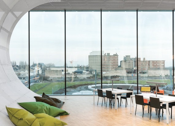 Структура здания создана так, что она освобождает фасады от их несущей функции и полностью открывает вид на город. Библиотека расположена на пешеходной набережной полуострова, примыкающей к обширному парку, который был спроектирован ландшафтными дизайнерами Мишелем Десвинем и Инессой Ханш. Все ландшафтные и развлекательные объекты, большой газон, морской центр, скейт-парк, речной отель, молодёжный хостел и пр. можно увидеть на разных уровнях библиотеки благодаря её стеклянным фасадам.