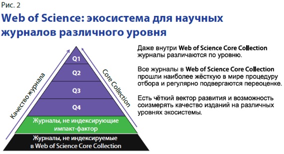 500 российских журналов должны быть включены в международные базы данных. Вопрос в том, какого качества должны быть эти издания. На платформе WoS сейчас более 1 тыс. журналов из России, но не все они одинаково качественные. В основе всего лежит Russian Science Citation Index (RSCI), а флагманский индекс — WoS Core Collection (CC) (рис. 2).