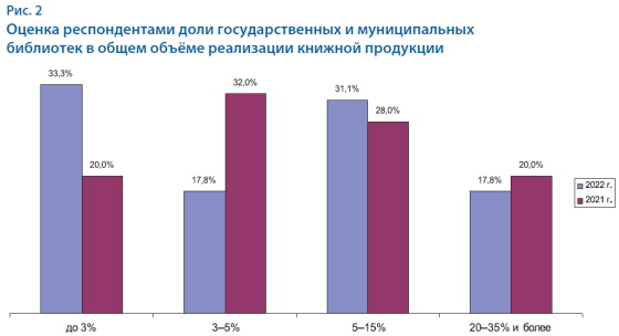 Что касается оценки респондентами доли государственных и муниципальных библиотек в общем объёме реализации книжной продукции (рис. 2), то сравнительный анализ позволяет сделать вывод о том, что существенных изменений за год здесь также не произошло: несмотря на колебания внутри групп, совокупно доля тех, у кого комплектование фондов в общем обороте занимало до 5%, и в 2022 г., и в 2021-м около 50%. Незначительные изменения и в остальных группах.