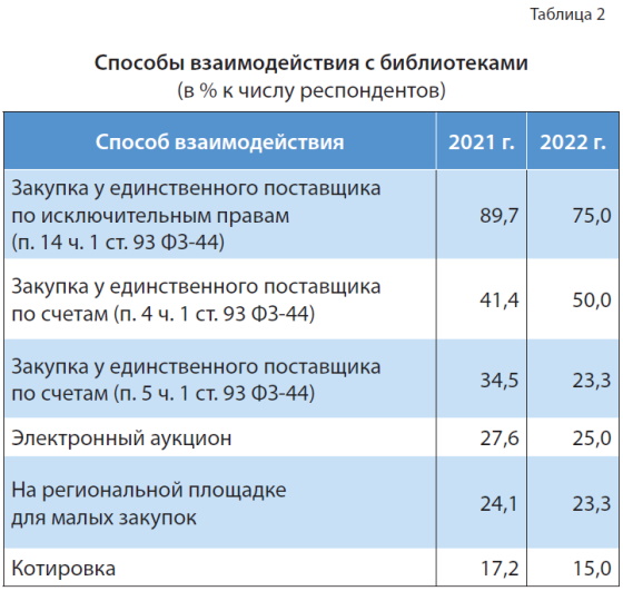 Анализ показывает, что имеют место некоторые изменения в структуре закупок у единственного поставщика. Так, снизились доли закупок по исключительным правам и по счетам в соответствии с п. 5 ч. 1 ст. 93 ФЗ-44 (годовой объём закупок до 5 млн рублей) и увеличился процент закупки по счетам в соответствии с п. 4 ч. 1 ст. 93 ФЗ-44 (до 2 млн рублей в год). Доли электронных аукционов, малых закупок и котировок практически не изменились. При этом в 2022 г. 5% респондентов дополнительно отметили, что передают библиотекам книги бесплатно — как в качестве обязательного экземпляра, так и в виде пожертвований.