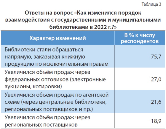 Отчасти подтверждают отсутствие значимых трансформаций ответы респондентов на вопрос «Как изменился порядок взаимодействия с государственными и муниципальными библиотеками в 2022 г.?». 41,7% опрошенных отметили, что изменений вообще не было. «Сами звоним по библиотекам от случая к случаю, никакой инициативы библиотеки не проявляют», — прокомментировали в НИЦ «Ладомир» (Москва). «Мы работаем с библиотеками 30 лет и продолжаем работать почти в том же режиме», — подчеркнули в издательстве «Лира-2» (Пермский край). При этом 75,7% из оставшихся указали, что библиотеки стали чаще заказывать книжную продукцию по исключительным правам (табл. 3). 27% отметили, что увеличился объём продаж через федеральных оптовиков (электронные аукционы, котировки). Похожие тренды наблюдались в исследовании прошлого года.