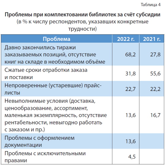 Как показал анализ, в 2022 г. более половины респондентов (52,5%) не испытали никаких трудностей при комплектовании библиотек за счёт субсидии (в 2021-м об этом сообщила треть опрошенных). «Если у библиотеки возник интерес (а это крайне редко), то проблем не возникает», — так прокомментировали ситуацию 3,4% опрошенных издателей. Ещё 10% не сталкивались с реализацией книг по субсидии. «Не было никаких заказов, несмотря на то что мы аккуратно представляем все новинки в Российскую книжную палату и в Российскую государственную библиотеку. Вообще не понимаем, как это работает», — заявили в издательстве «Аякс-пресс» (Москва).