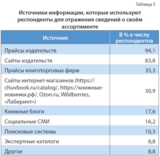 Как показывает анализ данных табл. 5, в структуре источников информации, используемых издателями для отражения сведений о своём ассортименте, с небольшими изменениями продолжают лидировать их собственные сайты и прайс-листы. Существенно снизилась в 2022 г. доля социальных СМИ: до 16,2% с 33,3% в 2021-м. Очевидно, это связано с блокировкой в прошлом году ряда зарубежных соцсетей и мессенджеров, которые издатели привыкли использовать для коммуникации с читателями и бизнес-партнёрами.