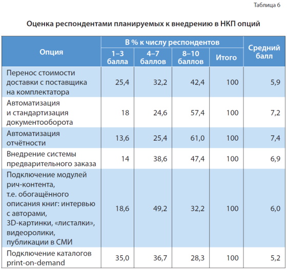 Как показал анализ, респонденты довольно высоко оценили все инициативы, и прежде всего связаны с автоматизацией документооборота и отчётности. Намного меньше энтузиазма вызывает возможность подключения модулей рич-контента и каталогов печати по требованию. Возможно, в первом случае респонденты просто не обладают всей полнотой контента, обеспечивающего книге добавленную стоимость, во втором — опасаются утечки данных. В любом случае отношение издателей к этим вопросам необходимо дополнительно изучать.