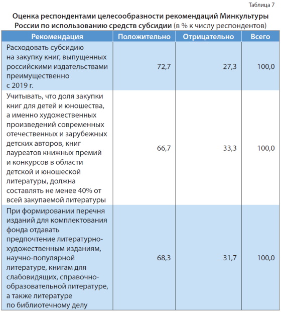 Оценку респондентами целесообразности рекомендаций Минкультуры России по использованию средств субсидии характеризуют данные табл. 7.
