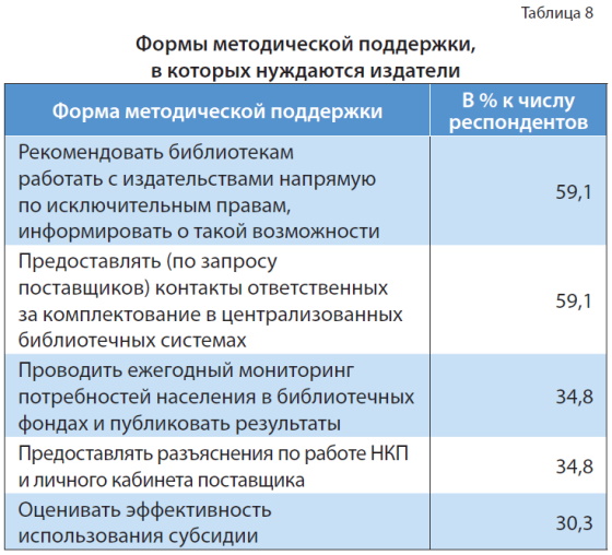 Как показал анализ, 37,4% респондентов необходима методическая поддержка по вопросам использования субсидии на комплектование библиотечных фондов. Желаемые формы представлены в табл. 8.