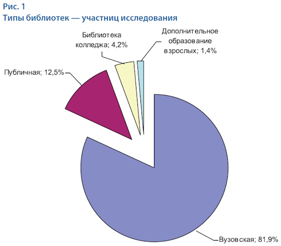 В исследовании приняли участие 216 библиотек различных типов. Как показывает анализ (рис. 1), подавляющее большинство (87,5%) в выборке составили библиотеки образовательных учреждений.