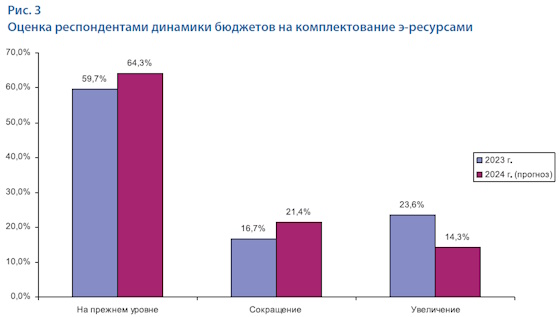 Оценку респондентов относительно динамики бюджетов, выделяемых на приобретение э-ресурсов, иллюстрирует рис. 3. По мнению почти 60% опрошенных, в 2023 г. объём средств оставался на прежнем уровне. 64,3% респондентов считают, что он сохранится и в 2024-м. 16,7% заявили о том, что бюджеты в текущем году сократились, 23,6% — что они выросли. С прогнозом на следующий год ситуация обратная: 21,4% полагают, что расходы сократятся, 14,3% — что они увеличатся.