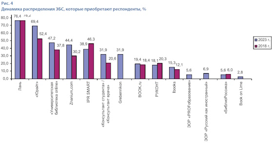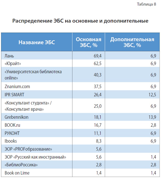 По оценке респондентов, ЭБС Лань, «Юрайт» и IPR SMART остаются ведущими игрока рынка отечественных ЭБС по охвату вузовских библиотек. В целом анализ позволяет говорить о том, что сохранили лидерские позиции, увеличили глубину проникновения на рынок крупные агрегаторы, которые реализуют образовательные инициативы, проводят профессиональные конкурсы и конференции, организуют сетевые комьюнити, в общем активно взаимодействуют с профессиональным сообществом.