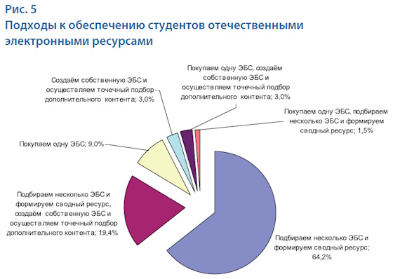 Подходы к решению вопроса по обеспеченности студентов отечественными электронными ресурсами иллюстрирует рис. 5. Так, 64,2% подбирают несколько ЭБС и формируют сводный ресурс. Этот показатель примерно соответствует тому, что был выявлен пять лет назад. Анализ позволил выявить, что 19,4% используют сочетание нескольких подходов: подбирают несколько ЭБС и формируют сводный ресурс, создают собственную ЭБС и осуществляют точечный подбор дополнительного контента. 9% покупают одну-единственную ЭБС. Доля библиотек, реализующих такой подход, сократилась в два раза по сравнению с 2018 г.