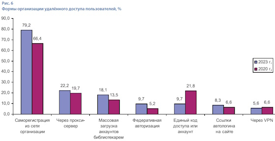 Рисунок 6 иллюстрирует формы организации удалённого доступа пользователей, реализуемые респондентами. Анализ показывает, что за три года возросли доли таких способов, как саморегистрация из сети организации, массовая загрузка аккаунтов библиотекарем, федеративная авторизация, и снизилась доля единого кода доступа или аккаунта.