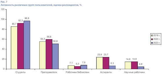 Вызывает обеспокоенность сокращение оценки респондентами доли активных аспирантов и научных работников. Возможно, здесь сыграло свою роль ограничение доступа российских университетов к зарубежным научным электронным ресурсам, которые необходимы этим группам пользователей (скорее всего, к ним можно отнести и преподавателей), в то время как студентам достаточно отечественных ЭБС.