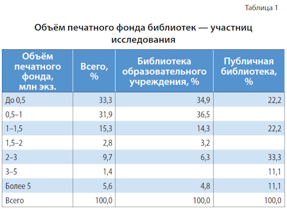 Как показывает анализ, ситуация с распределением объёма печатных фондов в целом повторяет ту, что наблюдалась в 2018 г., с тенденцией к некоторому увеличению. Так, основную долю продолжают занимать библиотеки, в фондах которых до 1 млн экз. печатных книг (65,3%; в 2018 г. — 70,2%). На 7,3% стало больше библиотек с фондами, насчитывающими от 2 млн экз. и более (16,7% в 2023 г. vs 9,4% в 2018-м).