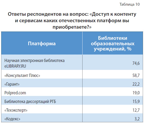 В табл. 10 представлены ответы респондентов на вопрос: «Доступ к контенту и сервисам каких отечественных платформ вы приобретаете?» Как показывает анализ, 74,6% библиотек образовательных учреждений подписаны на научную электронную библиотеку eLIBRARY.RU, 58,7% — на «Консультант Плюс». Этот ресурс является самым популярным у публичных библиотек (66,7%), более половины из них подписаны на Библиотеку диссертаций Российской государственной библиотеки (РГБ) и на «Техэксперт». Кроме указанных в таблице, вузовские библиотеки в единичных случаях подписываются на электронную библиотеку издательства МИФ, информационную систему «Континент», ЭБС «Проспект», видеотеку учебных фильмов «Решение», базы данных «Технорматив», «Ивис», СПАРК, «Финансовый директор», Cbonds.ru, «Актион 360», «Альпина», «Профи-Либ», «Информио», East View, имеют доступ к ФГИС «Национальная электронная библиотека». Некоторые вузы указывали в качестве специализированной платформы систему обнаружения заимствований Антиплагиат.