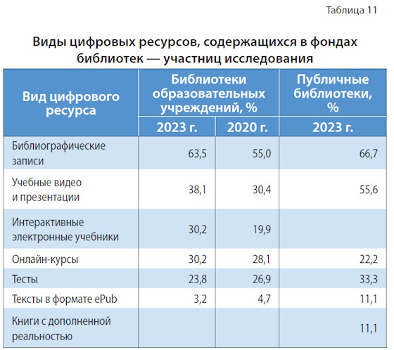 Представляет интерес анализ видов цифровых ресурсов (помимо pdf-версий печатных учебников), содержащихся в электронных библиотеках респондентов. Из табл. 11 следует, что 2/3 и образовательных учреждений, и публичных библиотек агрегируют библиографические записи. 38,1% библиотек учебных заведений хранят учебные видео и презентации, этот же вид контента популярен у коллег из публичных библиотек. Треть образовательных учреждений располагают интерактивными электронными учебниками и онлайн-курсами. Кроме того, 38,1% респондентов из учебных заведений и 55,6% из публичных библиотек отметили, что имеется возможность работать с отдельными статьями из журнала. Сравнение с показателями 2020 г. показывает, что рост проникновения в фонды библиотек наблюдается практически по всем группам альтернативных форматов.